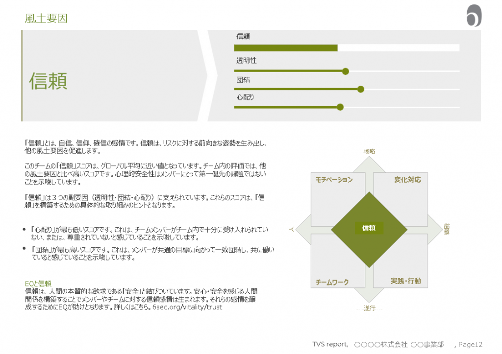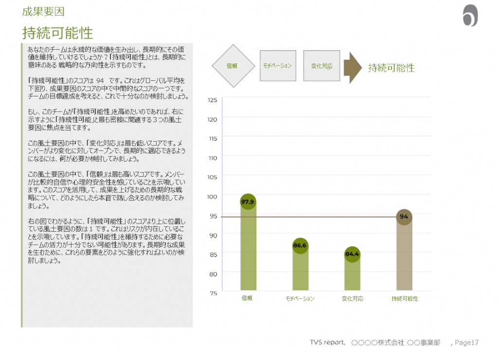 ※組織風土診断チームバイタルサイン(TVS)は組織のエンゲージメントに影響を与える風土要因(信頼、モチベーション、チームワーク、実践・行動、変化対応)の状態を明らかにし、組織のエンゲージメント向上に向けた具体的なアクションを提示してくれます。