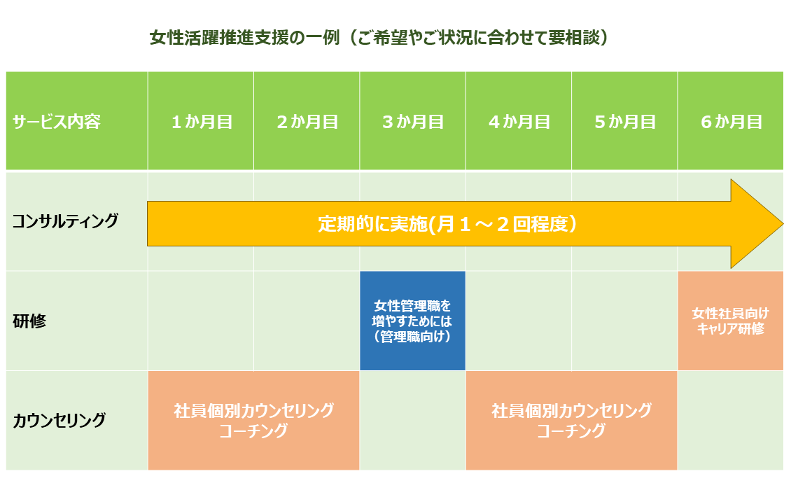 企業が成長するためには社員一人一人が活躍することが大切です。社員のスキル向上、マインド変化、モチベーションアップのための研修はもちろん、 女性活躍推進をすすめるための管理職向けの研修や女性自身のキャリアデザイン研修などの企業のダイバシティの取り組みを促進する研修を得意としています。人材が不足している今の社会だからこそ、多様な社員の活躍ができるよう会社全体のマインドを変えていきます。